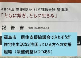 11月1日 ■午前と午後、居住支援に関する講演会の文字起こしをする。 ■夕刻に買い出しに行クリームシチューをつくって食べる ■吾妻山の裾辺りにも熊が出没してニュースになっている、今年は全国で熊に命を奪われている人がでている。熊も人里の方が餌が多いので山中に戻る気にならないのかも・・。 ■FB投稿 福島市にもようやく居住支援協議会立ち上がったそうだ・・。 居住支援に関する報告書づくりをお手伝い ─文字起こし・・・県庁OBの斎藤さんに依頼された最初の年は忘れた─ たしか3・11直後からだから十数年は過ぎようなかも。 今年の講演会での音録中に、10月、支援協議会・設立福島市と聞こえた。なんらかの理由があり住宅も生活にも困窮している人々を見守るなどし、支援を続けるための話し合いを続ける組織がなかったんだけど、この10月にようやく設立されたとそうだ。住宅や生活に困っている方々は相談に通うべきだ(法律もできてるので、総がかりで対応・支援してくれるよ) ◆身の回りを観ても少子高齢化と単身者世帯が4割へ突入しそうだ・・・という日本の状況は理解できる。加えて親の介護によって働き盛りの方が仕事を続けられなくなる「50,80歳問題」から現在は10年過ぎたので「60、90才問題」となり、方々に顕在化してしまっている。介護をしなければならない者は親・高齢者が亡くなるまで支援を必要とするので、家族は当然のように心身ともに疲弊する。活力ある地域社会も元には戻らない。戻るとすればこれから50年後に団塊ジュニア世代がお亡くなりに少子高齢化が底を打ってからだろう。 ◆地域も人もSNSの影響によりコミュニケーション能力も激しく劣化して重層的に地域がヘタレる様は一種の地獄絵に近いかもしれない。放射能が沈着してしまって人が入れ替わっているフクシマは既にそうなって久しい。高齢者自身の体力づくりは必須だけど、楽しく暮らす方法は唯一ある |