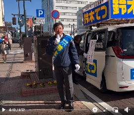 11月12日 ■雑誌社の記者にさそわれて、市長選の現職木幡さん新人馬場さんの演説を聞きまわる。 ■市議補選に立候補した鈴木さんに会いワイワイもする。その後実家に引き返しお父さんとワイワイする。選挙演説は残り3日で16日曜日は投票日 ■FB投稿 〇福島市市議補選に立った鈴木さんのお父さんとだべる 1980年からのお付き合いだから45年経ったんだ。俺はお互い年老いたと自覚しているだけど、元気な超老人は気にしていない言動は面白く参考になる。 〇選挙期間中なので現職市長にも直に質問できちゃう期間でもある。 なるほど分かった・・何が分かったかは表記せず。 (今日は晴れ。遊説日和だが気温下がり風も冷たい) 演説会の場所は雑誌社の方に教えてもらった ●午後は対立市長候補の演説会に行くことにした。直に演説に参加し支援者などにも触れ、顔ぶれを見まわしその後考え、投票するのが民主主義を健全に保つために一人でもできる行為だと分かり気持ちがいい。 〇福島市議会ウォッチ準備 市長選挙立候補の話を拝聴し、2ショットもする。 30代前半と若い候補。現市長より圧倒的に演説がうまい!質問したかった内容は演説ですべて話していたので質問無になった。新人が市長になれば対話を優先する市政を目指すだろう。(政治家は豹変するのでウォッチャー要るよ) 演説会の現場に立つことでしか理解できない、候補者の人柄、加えて参集した支持者たちの表情は対照的で、投票には有効な情報だった。映画『NO選挙、NO LIFE』を持ち出すまでもなく選挙は候補者の演説を聞くことが肝心。(市議会ウォッチは12月定例会からスタートにするかな・・) |