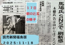 11月16日 ■福島市市長と市議補選の投票日。午後からでかけてウロウロし続け、19時半ごろから馬場事務所で当選のお祝いの渦にもぐりこんでウッチした。その後開票所に行福島補選の開票状況を眺めつづけて、市議補選確定の0時7分まで居座る。記者や候補者も来てたのでワイワイしならがの開票観察。 真夜中12時過ぎになり確定しました!鈴木てつさん当選おめでとうございます31800票新人ながら凄い得票数です。 鈴木さん市議の支持母体と馬場市長さんの母体は融合してて、分からない。福島市ないも自民党分解多党乱立の時がきたのかもしれません。 ■福島市長 初当選万歳の様子など ■ メディアの共同記者会見の様子 ぎゅー詰めなので揺れた動画です |