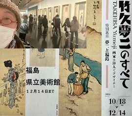 ■午前花田先生の投稿をweb頁に作成する ■午後 県美の竹下夢二展へ ■ FB投稿 竹下夢二展+常設展@福島県立美術館 気分転換する。 招待券・優待券があったので、次世代文教都市をめざすことになった福島市、美術館の賑わいをウォッチしてみた。日露戦争とその後の15年戦争に挟まれ、ゆるむことが可能だった大正ロマン時代をいきた人物らしく、職業も、移動も放浪気味逍遥感あふれ、それを感じさせる品々だった。デザイナーや挿絵作家として人気をはくするを裏付ける展示内容でもある。 観客数も分かり易さも手伝っているのだろうか、いつもの展示より老若男所が多い。館内は一部を除き写真撮影可能とこの計らいも珍しい気がした。飯炊き爺さんには二階の常設展の方が興味深かった。けれど鑑賞者は少ないのでゆったりと鑑賞できる点もお勧め。 参照:若者が好むのはダメージタウン? 消費社会の変化から見える未来像 [新潟県]:朝日新聞 |