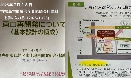 11月27日 午前中いい陽射しなので布団を干す。他は市役所から昨日いただいたが東口再開発の資料を眺める。気付いた点など調べる。改善してくれそうな人にメッセージを送る、その効果は不明だが伝える。 ■FB投稿 福島市の福島駅東口再開発に関する資料を手に入れる 福島市市議会ウォッチ。「知らない・分からない・・」という人が多いので、調べることは不可能なのか調査してみた。市役所の担当課に当たる、市民が知るための努力をしていないと分かった。都市計画課を訪ねると丁寧に実情を教えてくれた。誰でも調べる気があり、市役所に足を運べば全員参加の市議会で協議した際に配布された資料を手に入れることもできた。 市議会の全員協議会で話し合われた議事録はPDFで公開されている。 註)全員協議会は意見交換する場(議決は伴わない)東口再開発全員協議会議事録へ |