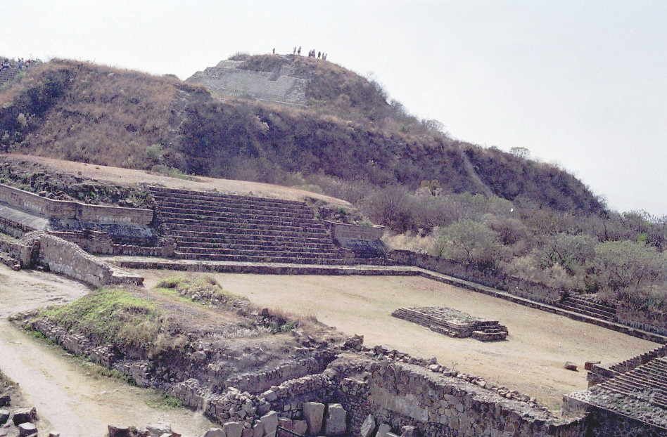 まず私たちは広大な広場に立つ。テオティワカンで見た小段状ピラミッドが広場の東側に一直線にいくつか並列しているが、よく見るとそれはピラミッドではなく、広場から直通階段で上がるようになっているテラス群であった。広場の中心長軸方向にはどっしりと重厚な長方台形の神殿がすわり、その後方にそれよりずいぶん規模の小さい神殿がある。西側には前後に段状ピラミッド(これは基壇)、そして広場の南奥には高さ30mはあろうか、巨大なピラミッド状の基壇がでんと控えている。