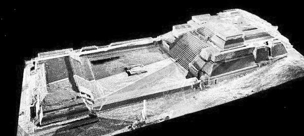 テオティワカンの「城砦」をさらに大規模にした様相を呈する。ただし「城砦」はロ型の完全は中庭囲み型のテラスだったが、ここはいくつかの、建物が基壇を成し、それが視覚的に連続して見えるように構成されているから、明らかにことちらの方が建築空間構成法としては複雑高度であろう。