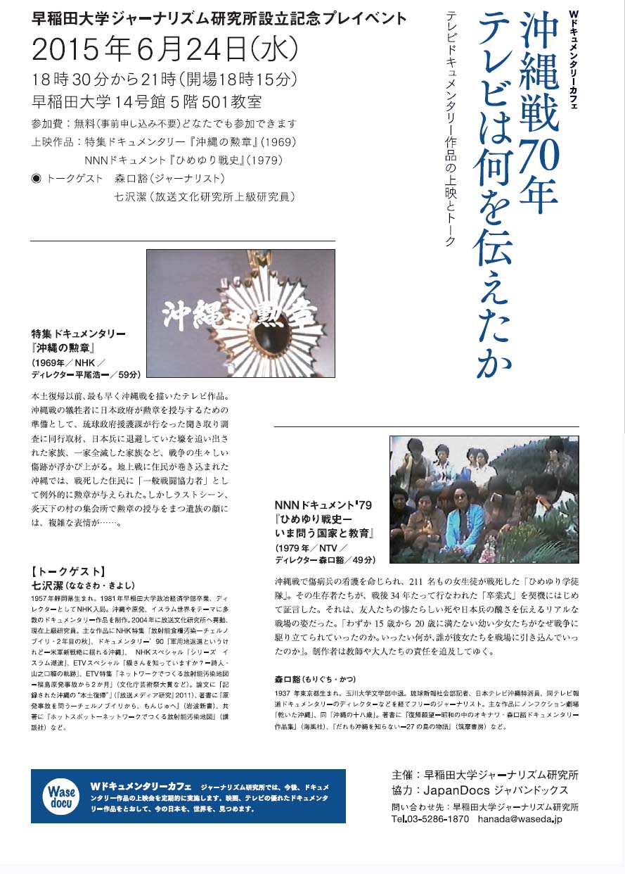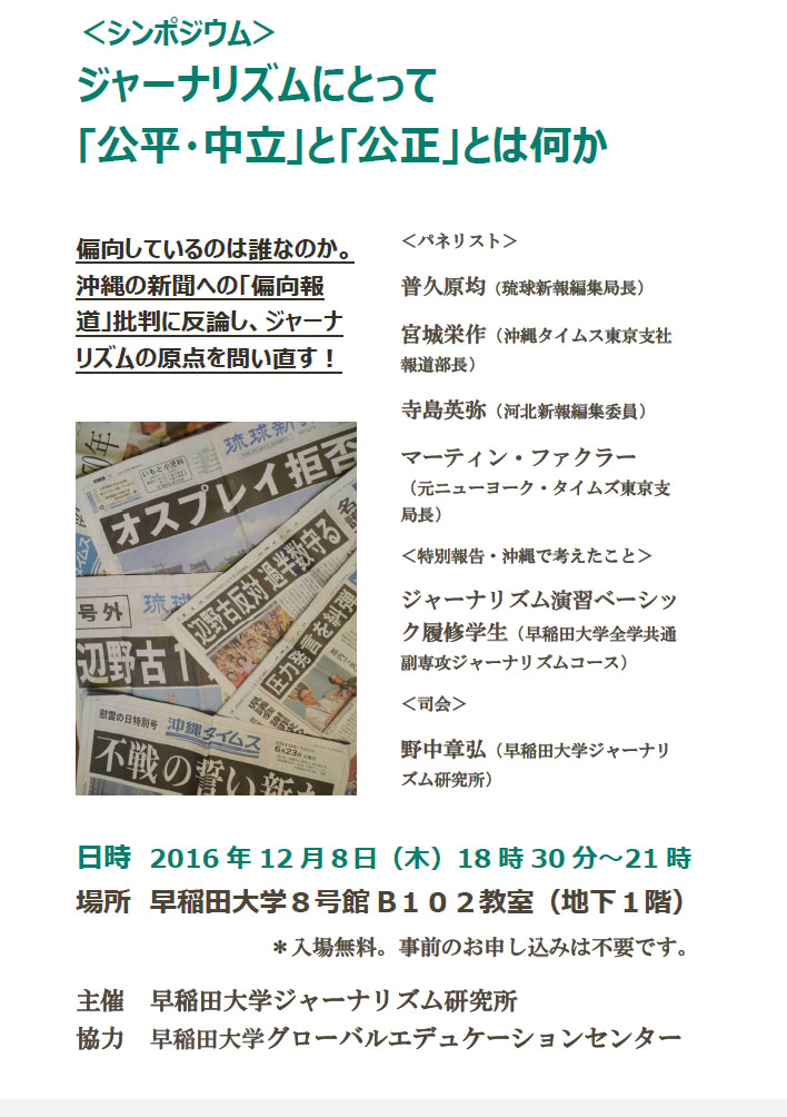 2017年5月17日 国際シンポジウム 「アジア地域における調査報道ジャーナリズム:その可能性と展望」 いま、アジアで活発な調査報道ジャーナリズム アジアの4つのニュース組織が一堂に会す画期的なイベント! このシンポジウムでは、日本における調査報道の来し方行く末を確認して足場を固めたうえで、さらにアジア地域の調査報道ジャーナリズムを担う4つの非営利組織が集い、それぞれの経済モデルやコンテンツを紹介し、その持続的発展可能性を議論するとともに連携の方向を打ち出していきます。 早稲田大学ジャーナリズム研究所およびワセダクロニクルが、米国の国際NGO、ジャーナリスト保護委員会(CPJ)との協力で開催します。 主催:早稲田大学ジャーナリズム研究所・ワセダクロニクル ジャーナリスト保護委員会(Committee to Protect Journalists: CPJ) 後援:早稲田大学総合研究機構 協力:世界調査報道ジャーナリズムネットワーク(GIJN) 日時:2017年6月4日(日)12時45分開場、午後1時15分開始 場所:早稲田大学総合学術センター 国際会議場井深大記念ホール 169-0051東京都新宿区西早稲田1-20-14 http://www.waseda.jp/prj-p-atlas/PDF/早稲田大学国際会議場地図.pdf 入場無料 同時通訳あり 12:45 開場 13:15〜13:30 開会挨拶 花田達朗(早稲田大学ジャーナリズム研究所長) 13:30〜15:00 セッション1「日本における調査報道ジャーナリズムの経験」 パネリスト:依光隆明(元朝日新聞特別報道部長、「プロメテウスの罠」キャップ) 熊田安伸(NHK報道局取材センター社会部専任部長) 石丸次郎(アジアプレス・ネットワーク:APN) マーティン・ファクラー(元ニューヨーク・タイムズ東京支局長) 司会:スティーブン・バトラー(CPJ、アジア・プログラム担当) 15:00〜15:10 休憩 15:10〜16:45 「ワセダクロニクル緊急取材 アメリカの調査報道は今〜市民が支える報道〜」 上映: 大矢英代(ワセダクロニクル) GIJNからのメッセージ: アレッシア・チャラントラ(GIJN) セッション2「アジアにおいて調査報道ジャーナリズムを支える新モデル」 パネリスト:ヨンジン・キム(「ニュース打破」編集長、韓国) ゲマ・バガヤウア=メンドーザ(「Rappler」、フィリピン) シェリー・リー(「報導者」編集局長、台湾) 渡辺周(「ワセダクロニクル」編集長、日本) 司会:キャサリン・キャロル(CPJ、副会長) 16:45〜17:00 閉会挨拶 ジョエル・サイモン(CPJ、専務理事) |