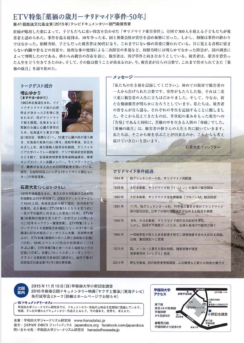 | Wasedocu 3 2015年10月1日18時に開催します。上映作品はNHK-ETV特集『薬禍の歳月ーサリドマイド事件・50年』です。本年度の放送文化基金賞テレビドキュメンタリー部門最優秀賞と演出賞を受賞しました。 (当日のレポートを読む) Wasedocu 3 開催! Wドキュメンタリーカフェ 終わらない薬害を考える 2015年10月1日(木)18時から20時30分(開場17時45分) 早稲田大学小野記念講堂 参加費無料(事前申し込み不要)どなたでも参加できます ■テレビドキュメンタリー作品の上映とトーク ETV特集『薬禍の歳月−サリドマイド事件・50年』(2015年/NHK/ディレクター石原大史) ■トークゲスト 増山ゆかり(サリドマイド被害者、『薬禍の歳月』出演者) 石原大史(『薬禍の歳月』ディレクター) ■作品内容 第41回放送文化基金賞(2015年)テレビドキュメンタリー部門最優秀賞 妊婦が服用した薬によって、子どもたちに重い障害を負わせた「サリドマイド薬害事件」。全国で300人を超える子どもたちが被害者と認められた。事件を巡る裁判は、10年争った末、国と製薬会社が責任を認め和解に至った。しかし、和解は事件の終わりではなかった。和解当時、子どもだった被害者は50代になり、これまでにない体の異変に襲われている。目に見える奇形に留まらない内臓や骨などの異常や、無理な体の使用による二次障害の多発など、和解当時には明らかでなかった障害が、国の調査によって判明したのである。終わらぬ被害の存在を前に、被害者は、再び事件と向き合おうとしている。被害者は、薬害を背負った人生をどう生きてきたのか。そして、その傷は償うことが出来るのか。今、被害者が自らの言葉で、これまで伏せられてきた「薬禍の歳月」を語り始めた。 ■トークゲスト紹介 増山ゆかり(ますやま・ゆかり) 1963年北海道生まれ。ドイツでサリドマイド剤の出荷停止が決まった2年後に生まれるが、母がサリドマイド剤を服用。生後まもなく両腕の欠損と心臓の異常のため、北海道から東京の施設(世田谷、板橋など)へ。10歳で心臓の病が落ち着き、北海道の家族の元に帰る。高校卒業後、自立をめざし上京。漢方薬輸入販売会社勤務、カリフォルニア大学バークレー校留学、アジア経済研究所勤務などを経て、全国薬害被害者団体連絡協議会、薬害オンブズパースン会議メンバー。ライフワークとして、障害がある人のための料理教室を開いている。現在、公益財団法人いしずえ(サリドマイド福祉センター)の常務理事。 石原大史(いしはら・ひろし) 1978年福島県生まれ。東京大学大学院総合文化研究科国際社会科学専攻修了。2003年ディレクターとしてNHK入局。長崎放送局を経て現在、制作局ETV特集班。主な番組にETV特集『さよならを言う前に−我が子の脳死と向きあった家族』(10年)、ETV特集『枯葉剤の傷跡を見つめて−次世代からの問いかけ』(10年ギャラクシー賞優秀賞)、ETV特集『ネットワークでつくる放射能汚染地図』シリーズ(11年から 石橋湛山記念早稲田ジャーナリズム大賞、芸術祭大賞ほか)、ETV特集『飯舘村一年−人間と放射能の記録』(12年)、NHKスペシャル『空白の初期被ばく』(13年JCJ賞)、ETV特集『毒と命−カネミ油症母と子の記録』(13年)。共著に『ホットスポット−ネットワークでつくる放射能汚染地図』(講談社)。本作で第41回放送文化基金賞(15年)演出賞受賞。 2015年|90分|語り:渡邊佐和子|撮影:角文夫|映像技術:一瀬賢司|音声:正井淳之 小川 一登|音響効果:日下英介|編集:高橋慶太 吉岡雅春|コーディネーター:ペティーナ・コバヤシ|ディレクター:石原大史|制作統括:鶴谷邦顕 田波宏視|制作: NHK ■Wドキュメンタリーカフェ 早稲田大学ジャーナリズム研究所では、ドキュメンタリー作品の上映会を定期的に実施しています。 映画、テレビの優れたドキュメンタリー作品をとおして、今の日本を、世界を、考えます。 ■チラシデザイン:鈴木規子 主催:早稲田大学ジャーナリズム研究所 www.hanadataz.jp 協力:JapanDocsジャパンドックス japandocs.org facebook.com/japandocs 問い合わせ先:早稲田大学ジャーナリズム研究所 ![]() ![]() |