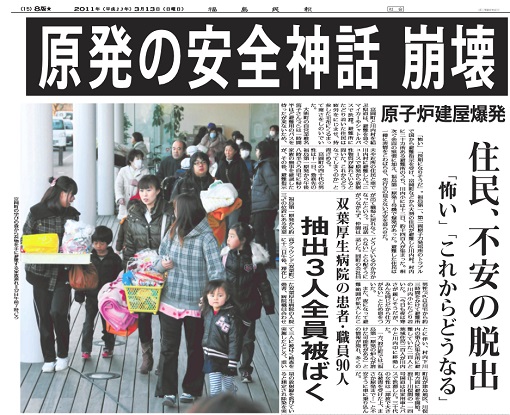 だから311のときは宮城沖地震がおきたなーと思ったんだ。福島第一原子力発電所と福島と冠していることで全県被ばくしたイメージになってしまった。大熊原子力発電所とか双葉原子力発電所にしておけば、風評被害が小さくなっていたと思う。柏崎刈羽とか大飯とか県名が冠されていない。下水処理場も同様だが原発の所在を知らずに首都圏の人は電気を使っているのではないかな。 稼働したときは日本初の原子力発電所だったんで全県民で胸張ったんだろうね。全県上げて誘致した誇らしい施設でもあったので。福島を冠したことで福島全県被ばくのイメージが流布したんだろうね。 龍光寺:思い出してみるとパニックになっているような感じも受けられつつ、冷静になられている方も中にはいらっしゃったということですね。佐藤さんは予め想定していた、ということですものね。 2011年3月13日県紙 ![]() 佐藤:宮城沖地震の襲来を予想してたし、福一原発の事故のことは、東電と県知事のバトルが続いてたので、原発事故に関しては少し勉強してて、地震で事故ることは想ってたんです。 原発事故が起きときのためにサージカルマスク、ゴムがついて顔にぴったり付着するマスクを買って備えていたんだよ。 放射能が飛び散ったらサージカルマスクで一時し暮らして、放射能をやり過ごしてしのげばいいやと備えていたんです。渋谷だったか覚えてないですがあるだけ買って備えてたんです、ゴムが劣化してたいかもですが。原発事故が起きた直後に「マスクあげる」と言っても無反応でしたね。 水道管が破裂して水道が機能しなかったので湧き水をくみに老若男女が長蛇の列、なんだけど、誰もマスク無しですものね、放射能雲への備え無でしたよ。教えても嫌われるし、パニック起こすのもね、浴びても即死しない。汚染された空気が来ているのかも分からないんですよ。色も臭いも無いので。人間の感覚では放射能の存在が分からないんですよ。 湧き水をくみに集まる人々マスク無 2011年3月14日 福島市内 ![]() 3月13日県紙面 マスクしないで人々が避難してる姿 ![]() スピーディーを使って気象庁が放射能の行き先と濃度を広報することになっていたんだけど(詳しいmy記録へ)、風向きに加え放射能の放出量を加算して計算し汚染の拡散を予測する仕組み。 だけど、東電が気象庁に放出量を伝えないので、計算できなかった。汚染がどちらの方向に向かいますと被災民に告知するためには使えなかった。で浪江町の人々のように一番汚染された場所へ避難ししまいました。汚染された避難地で数日外で子供を遊ばせてしまい被ばく量を増やしてしまう悲劇も起きたんですよ。後日予測計算をしたら、20ミリシーベルトぐらい被ばくしたらしいです。 後になって映画「東電のテレビ会議〜49時間の記録」を観たけど、東電は放出量を知ってて、東京本社との話し合いで発電所のサイト内では汚染量と方向について語り合っていました。専門家集団だし自分たちが被ばくしては事故処理に対応できないので、汚染方向を当然計算して発電所の事故処理するでしょうよ 今後は原発立地傍の人は季節ごとの気象庁の風向き予測観て予備知識を身に着けておいて、原発で事故が起きたら避難方向の判断として活用するのがいいと思うね。 だが、巨大な地震が起きると電気も来なくなる。電源に頼った情報の取得がほぼ止まってしまう。山勘だよりになるね。災害に遭った当事者はそこで何がおきているのか客観視するためのツールが無くなるんだね。 龍光寺:そうですよね、近くしか見えないですものね。 佐藤:電気の要るTV・ラジオは災害現場では役に立たないんだけど、携帯電話は電池と電源補充器さえそなえていれば視聴できたんだよ。 11日の夜、携帯画像を見たら菅総理が会見してて、福島原子力発電所の事ばかり言ってる!かのように聞こえて。、これはチェルノブイリ事故並みの事故が起きるんだなーとその時に覚悟して身構えたよ。 「原子炉が正常に停止したのか」さえ分からなかったので、最悪は核分裂したまま爆発するんじゃないかと思ったわけですよ。県内には10機だけど福一には6機、原子炉がある。原子炉が稼働したまま次々に爆発する絵柄が浮かぶわけだよ。こりゃー福島県民は死ぬかもしれないなーと情報ないので想いました。 春先は東南の風が多いので、原子炉から北西の方向に我が家は在るので、さらに緊迫し身構えちゃったわけよ。 龍光寺:本当に事故が起こって初めて調べましたね。調べたり勉強したりしました。冷静になるためにはそこから始めるしかない。 佐藤:政府は被災民に役立つ情報は流したのかも知れないけど、俺は正確に全てを受け止めてなかった。でツイッターは動いていたのでそこに記録を付け続けましたね(左の欄に3月12日のツイッター録を貼ります)。ですから時々携帯電話を見ているわけよ、そうするとドイツの方が風向きと放出量で計算して汚染された気流・プルームの流れる様を動画