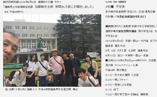 9月9日京大 柳沢研究室の皆さんと住宅課を訪ねた。そこで応急仮設住宅について質疑応答と交流対話を頂きました。その全ての内容を文字記録とし3部持参。今後のアドレスもいただきました。多数の学生さんへもこの情報提供できたらいいな。