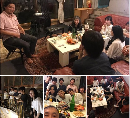 9日の夜我が家で久しぶりに建築あそびをすることにしたので、寝具などを干したりする。夕方暑さがおさまった頃合いをみて庭の草をむしる。もう夜にあるとコオロギがが鳴いている。秋まじか。 FB投稿より 京都大学生7人と「建築あそび」の準備する 久々にブチ「建築あそび」を我が家で開催することにした。快晴ま久しぶり。かんかん照の下で寝具を干す。(雑魚寝しながら夜通しだへる、寝たい奴はワイワイの側でいびきokための寝具干し)数枚の寝具干すだけでも暑くて汗だく。が気持ちよい。 柳沢先生と学生さん8名による「建築あそび」テーマは福島県内の応急仮設住宅など、福島県内の伝建古建築について、三つ目は俺が長年にわたり実践している「星座型居住」について。てんこ盛り過ぎる内容だが、寝る準備はほぼできたかも。布団に転がりながらも駄弁る。 ◆建築あそびの例としての集合写真。これは2002年11月花田達朗先生との「建築あそび」で撮影した絵で顔が参加した人でないと分からないぐらいに粗くしてある。(たぶん今年中に刊行されるときいているが、その時の記録は花田達朗全集の1冊の中にに編まれるとのこと)
