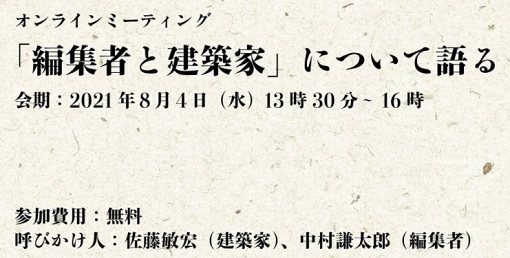 | ■2021年7月4日 呼びかけ文 編集者の中村謙太郎さんと佐藤敏宏は四半世紀に渡り「記者と取材対象者」の関係にありました。その地続きで現在はフェースブック友達となり日々WEB情報を共有しております。 このような心地よい付き合いをさせていただいていますが、その間「記者あるいは編集者と建築家」について、さらに加えれば「編集者と建築家の健全なありかた」について話し合ったことがありませんでした。 そこでZOOMを活かし「編集者」と「建築家」や健全なあり方などにも関心をお持ちの方々とともに語り合いたいものだなーと思い、この企画を起動させることにしました。 目的は特にありませんが、旧媒体(紙)から新媒体(インターネット)へ移行中の現在は、どちらの良さも活かす関係が成り立ってはいないのではないかと思います。 もしかすると、この機会に新媒体における記者・編集者と建築家の好ましい関係を描きだすことができるかもしれません。 良し悪しがあるにせよ両者の好ましい関係性を描きだすためには若い人々の参加が要るわけですが、老人の呼びかける事ですので期待せず参加いただければ幸いでございます。 (呼びかけ人/佐藤敏宏・中村謙太郎) 会期:2021年8月4日(水)13時30〜16時 参加費用:無料 参加方法:人数を把握するため、このイベントページにて参加表明をお願いします。追ってZOOMのURLをお知らせします。 ※注:発言の肉声はそのまま文字にお越し記録としWEBにて公開します。あらかじめご了承ください。 |