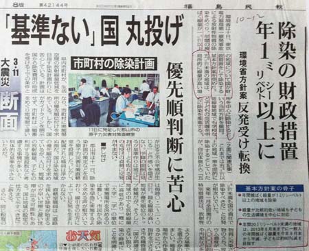 主権者必見> 児玉龍彦先生が超有名になった衆議院TV 7月27日 議事録集へ (第177回通常) 第14号 平成23年8月23日(火曜日) 平成二十三年三月十一日に発生した東北地方太平洋沖地震に伴う原子力発電所の事故により放出された放射性物質による環境の汚染への対処に関する特別措置法案起草の件 衆議院TV8月23日環境委員会 福島選出石原洋・太田・吉野議員の質問を参照ください 環境回復検討会(第2回)平成23年9月27日 議事録へ 2011年9月28日 民報 大波地区多目的ホールで除染仕方を説明市は2年間で毎時1μsv以下にする目標と 福島市内11万戸を対象とした除染計画を発表した 27日の議事録から推察するとこのようは判断は拙速と想うのだが700億円から1000億円と推定される除染工事を福島市は前のめりに発表した。 政治的取引などの裏付けがあったと推測できる (大きな記事で読む) ![]() 2011年10月03日 細野環境相 1〜5osv/年汚染地域も国が取り組むと強調 ![]() 2011年10月12日 年 1osvを財政処置へ至る 裏の話し ![]() 10月19日 大波地区の除染始まる (大きな記事で読む) ![]() 野田総理 大波視察 土に置かれたサーベイメーターに放射能着いちゃっているW〜 (大きな記事で読む) ![]() 2011年11月02日 大波地区除染の低減率 が発表となるも 作業結果 低減率引くし (大きな記事で読む) 1月1日 放射性物質を除染を推進する 放射能物質汚染対策特別措置法全面施行される 2012年 1月13日 県除染作業の基準単価を設定し示す 戸建て住宅 敷地400u(120坪)1軒当たり 合計70万円(壁洗浄あり) 壁洗浄無し 60万円 阿武隈山地の一文化(my実家傍の人) 消滅しかけてる様子が解ります) (大きな記事で読む) ![]() |