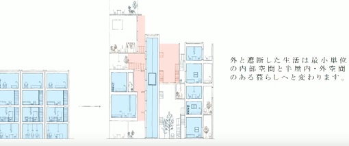 辻:二つの、手法っておっしゃってましたけど。回転と反転を選んだ理由と、あるいはそれ以外の手法の可能性は無かったのかと、いうことを聞かせてください。 118:回転と反転を選んだっていうのは、まず、リサーチからファサードを分析して、それ、ファサードのマテリアルの切りかわりに着目したので。その切りかわりというのを、どう設計に取り入れていこう、ってなったときに、そのまま使うんではなくって回転することで、縦が横になって、切り替わりのリズムが、水平だけだったのが町に対して垂直に延びるっていう展開で回転というのを選んで もう一つは、通りに対して、ファサードをリサーチしたときに、その裏側のインテリアがどうなっているかっていう興味が出て来て。その内側を見て来たときに、そこも、切り替わりが凄く頻繁で。内と外でけっこう似ているけど、それを反転したときに、内側、内部空間と、外部しかなかった町に。そういた曖昧な空間が出来るんじゃないかっていうので、反転を選びました 辻:やっぱりゲームっぽい感じがして。そのルールを自分で決めて、その中でくるくるさせて、パズルでこうやって行って、面白い空間を作ろうと。 その面白い空間を作りたいというのは、なんとなく分かるし、外部と内部が反転してとか。その雑多な空間が上まで続くっていうのは、分かるんだけど。それによってどういう、なんていうのかなー。他の人も共感できるような、いいことがどこにあるのか。君の個人のルールに、誰が乗っかるのかっていうのが。ずーっと気になって。 それでルールに乗っからなくっても、出来た空間が、人が乗っかれれば、それでいいと思うんだけど。出来た空間によって、なんて言うのかな。生まれているいいこと、教えてください 118:いい事というのは、まず、建物同士の関係というのが無かった現状を、まず、関係を持たせること。ボリュームごとで、ファサードを共有したりであったり、開口から光や風を通したりっていう関係を作る事と、空間として均質であった、この町に多様な質をもたらすということですかね。 |
