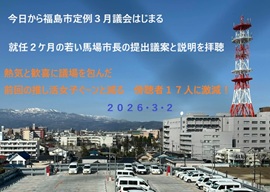 3月2日 ■米とイランの戦争によってスタグフレーションが起きるだろう。物価高特に灯油が馬鹿上がりしそうだから早めに床暖を使うのやめよう。円安にぶれるだろうから輸入物価も上がる。喰い物値上がりか・・お金が無いのでやりくり考えよう。 ■今日から三月定例市議会が開かれるので傍聴しに行く。30分前に着いたが受付番号は2だった、最初に受け付けた女性と少し話す。今日の傍聴席には17人で内福大生の男女だったから、一般市民は15名。予想をはるかに下回る数だった。12時前に全て討議は済み散会となった。6日からは各会派の代表質問とその後一般質問実施され27日閉会予定。 馬場市長と行政の方々が着任3ヶ月で宥和したようで、和やかで微笑ましい様。若い市長を盛り上げようとする雰囲気も伝わる。 ■午後、ノンビリしたあとスパーに買い出しに行き、夕飯を作る。 ■このところ最初に目覚めて直ぐに忘れてしまう前に夢占いを続けている。眠っているけど脳は活動しているので無意識の自分の現在を知ることになるので、正確ではないだろうが参考になる。 ■FB投稿 福島市3月定例市議会傍聴する (馬場市長推し活の方々激減しましたね、あの熱は冷めるの早い。政治家のそれぞれは日々発信し人気を保持するしかない時代に突入したようです。これは国会の状況に似ている) 今日から27日までの26日間で定例市議会が始まったので傍聴する。見どころは若い馬場市長とオール野党となっていた市議会議員の関係。加えてこの2ケ月で市職員との関係がどうなったのか定点観測する。今日の内容は市長が提出した議案の説明を市議と傍聴者が聴くこと主。補正予算の審議と可否を採決すること。 まだ一般質問を傍聴していないので総括はできないが、特に目立ったのは傍聴者数の激減。若いい珍しい市長の議会での姿を一目とおしかけた前回とはうってかわり傍聴席は静かでゆったりとしていた。東口再開発については5月に議会説明をすると市長が語っていたし、代表質問と一般質問で多数語られるだろうからその時に詳細を書くことに。 ・来年度からは各支所で意見交換会が実施されるとのこと。就任三か月で福島市の各種データーをまとめ行政活動に活かしたデータ行政の基礎は出来つつあるとのこと。安心できる福祉は子育て支援金や、四月から小中生の給食費無償化。千円で買えるプレミアム商品券を全員に配布、住民税非課税世帯へは1戸1.5万円支給するなど 3つの柱と9つの主なる政策の説明があった。 ●本会議後、文教福祉委員会で裁判の結果、遡って国の生活保護費を繰り上げ加さん支給にともない事務費加算予算や手続きについて市から提案がある。そのご補正予算は可決された。(詳細略) |