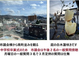 3月13日 ■FB投稿 午後市議会ウォッチ。 好く晴れた陽射しの下、自転車漕いで市議会へ。今日午前は中学で卒業式がひらかれたので午後のみの市議会。2名による一般質問。ざっと主な点だけメモ。 最初の登壇者。支持者が20名ちょい押し寄せていて、傍聴席が彼らの居間でもあるかのように・・駄弁る。質問内容が聞き取れないので、注意しやめてもらった。質問終了後、議長と連れしょんだったので傍聴席の私語は議長席で聞こえてますか?と問うと、「聞こえてない」とのこと。当選一回目の応援団なのだが若い人々が「ここは自分たちのサロン気分で」と勘違いしちゃうのは、議会をなめ切っている、そのような態度にみえた。市議の質問内容についてだが、飯炊き爺さんの勘違いであればいいのだが・・・問題のある現地に立たず、取材せず、webで集められるような情報やネタに聞こえちゃった。(間違いでありますように!) 2人目は、衆議院選挙の日程を質問したので、市の選挙管理員会の奮闘ぶりは詳細に知ることになった。通常は4週間ほどは解散後必要だそうだ。関係者は夜遅くまで頑張りなんとか間に合わせたそうだ。次に、人口減にともない市では婚活支援である縁結び応援事業をしているのだが、研修によってマリッジサポーター23名が活躍しているのだそうだ。爺さんの世代で言えば、市が仲人事業をしているということらしい、知らなかった。問題はパートナーを探している方の個人情報が駄々洩れになるのではないかとの問い。どんな方法で漏れ防止しているのか聞いていても、分からなかった。市役所が仲人事業する必要がある事態なんだとは大きなお世話なのか必要なのか分からんけど、飯炊き爺さんは驚いた!「成熟しきった世にあって、結婚に興味が無くなってしまうのは考えられる。ほっといたらいいんじゃないかな・・というと周りから白い目で見られてしまう世情なんだと知った。 終了後、昨日市議会で東口再開発についていい質問をしていた市議に近づいて立ち話をする。市議たちも市役所もなすすべなく困り切っているのが分かる、質問もしにくそうだけど、ぎりぎりの所まで迫っていて、大変よかった。 議会で多様な市議の質問に接していると、市議は市民の市政に対する鏡そのものに見えてしまう。一生懸命足で勉強している市議もいて、いろいろだ、面白いものだ。 13日の市議会は午後開催(卒業式のため) 玄米を買いに農協直販所にいく。昨日、床暖の給油に来て、リッター124円は137円に戦争による便乗値上げ。上げると言い訳して値下げしないのが常態となっている。 空模様は卒業式にはまあまあで、吾妻山はくっきり見える。峰々には雪雲が西風におされてのぼって見える。会津地方は雪なのかも。で、まだ寒い風が吹くけれど庭の桜のつぼみは脹らみはじめた。飯炊き爺さんは自分の中学校の卒業式当日のこと覚えてない。可愛いい女の子に「さようなら!」と言えばよかったと今は思う。御婆さんになった彼女たちは千万家のオープンハウスにやってきて、中学時代のことを聞かせてもらった。中学生の俺ってそう思われていたのか!と驚いた(笑。他者が俺をどう思てもよいし問題は無し、なので笑って聞いていた。人間は面白い生き物だと今でも思うから変わってないな俺。 |