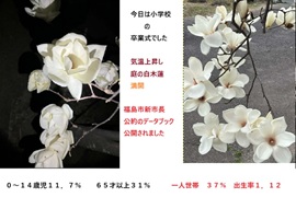 3月23日 夕方前まで ■庭の白木蓮は満開となる。 米・イスラエルとイランの戦争は混乱し拡大し続けているようだが、正確な情報は何か分からないので、ほとんどwebでは観ていない。 株は下落しているニュースも流れ、原油高は高く成りづづけるようだ、それは即灯油の値上がりしてしまってことなので、貧乏になってしまった飯炊き爺さんは大いに困る。なぜなら原油が上がるとあらゆる物価も上がるからだ、収入なしなので入手可能な食材が極端に少なくなってしまうよね。喰う量を減らしてダイエットだと空元気するぐらいしかなさそう。 唯一明るくなったことは妻の病がよくなってきて、対話が成り立つようになったことなので、 長年つづいていた病支援の重荷は軽くなった。なんとかしたいと対応続けてきたので、すこし嬉しい。ちょっとした切っ掛けで症状が悪化することもあるので、気は抜けない。 ■FB投稿 家族総出で歩いている?⇒ 小学校の卒業式。 庭の白木蓮一気に満開 夜の白木蓮は風に揺らぎ美しい。気温上昇中の日中もハクモクレンの香りで満たされ妖艶の気だだよい。 新市長公約であるデータブックは公開。(webサクサク不足) 福島市の0〜14歳児11% (我が家周り0%) 65才以上31%(我が家の周りは50%超)一人世帯は予想より多く37%も |