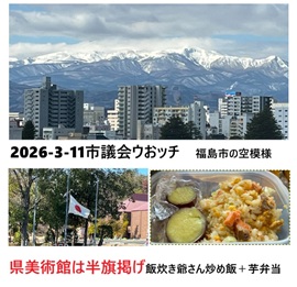 3月2日 ■米とイランの戦争によってスタグフレーションが起きるだろう。物価高特に灯油が馬鹿上がりしそうだから早めに床暖を使うのやめよう。円安にぶれるだろうから輸入物価も上がる。喰い物値上がりか・・お金が無いのでやりくり考えよう。 ■今日から三月定例市議会が開かれるので傍聴しに行く。30分前に着いたが受付番号は2だった、最初に受け付けた女性と少し話す。今日の傍聴席には17人で内福大生の男女だったから、一般市民は15名。予想をはるかに下回る数だった。12時前に全て討議は済み散会となった。6日からは各会派の代表質問とその後一般質問実施され27日閉会予定。 馬場市長と行政の方々が着任3ヶ月で宥和したようで、和やかで微笑ましい様。若い市長を盛り上げようとする雰囲気も伝わる。 ■午後、ノンビリしたあとスパーに買い出しに行き、夕飯を作る。 ■このところ最初に目覚めて直ぐに忘れてしまう前に夢占いを続けている。眠っているけど脳は活動しているので無意識の自分の現在を知ることになるので、正確ではないだろうが参考になる。 ■FB投稿 福島市3月定例市議会傍聴する (馬場市長推し活の方々激減しましたね、あの熱は冷めるの早い。政治家のそれぞれは日々発信し人気を保持するしかない時代に突入したようです。これは国会の状況に似ている) 今日から27日までの26日間で定例市議会が始まったので傍聴する。見どころは若い馬場市長とオール野党となっていた市議会議員の関係。加えてこの2ケ月で市職員との関係がどうなったのか定点観測する。今日の内容は市長が提出した議案の説明を市議と傍聴者が聴くこと主。補正予算の審議と可否を採決すること。 まだ一般質問を傍聴していないので総括はできないが、特に目立ったのは傍聴者数の激減。若いい珍しい市長の議会での姿を一目とおしかけた前回とはうってかわり傍聴席は静かでゆったりとしていた。東口再開発については5月に議会説明をすると市長が語っていたし、代表質問と一般質問で多数語られるだろうからその時に詳細を書くことに。 ・来年度からは各支所で意見交換会が実施されるとのこと。就任三か月で福島市の各種データーをまとめ行政活動に活かしたデータ行政の基礎は出来つつあるとのこと。安心できる福祉は子育て支援金や、四月から小中生の給食費無償化。千円で買えるプレミアム商品券を全員に配布、住民税非課税世帯へは1戸1.5万円支給するなど 3つの柱と9つの主なる政策の説明があった。 ●本会議後、文教福祉委員会で裁判の結果、遡って国の生活保護費を繰り上げ加さん支給にともない事務費加算予算や手続きについて市から提案がある。そのご補正予算は可決された。(詳細略) |